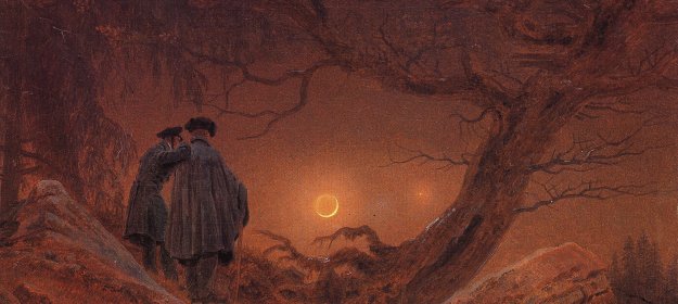 Der Wanderer über dem Nebelmeer, 1818, das Gemälde zeigt einen Mann, der von einem Felsen aus über ein nebliges Steinfeld blickt.Zwei Männer, die den Mond betrachten, 1819, stellt ein Brauntönen zwei Männer dar, die zwischen verwachsenen, laublosen Bäumen stehen und durch eine Dunstwand den Mond ansehen.
