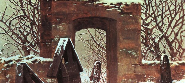 Landschaft mit Grab, Sarg und Eule, 1836/37, das Friedrich Gemälde hat ein frisch ausgehobenes Grab, einen Sarg und eine, auf dem Sarg stehende, Eule als Motiv. Um die Grabstelle wachsen große Disteln und das Werk ist sepia-farben.