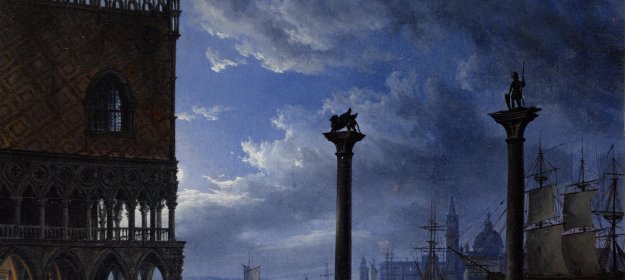 Ende Oktober 1835 verließ Friedrich Nerly Rom um sich in Venedig niederzulassen. Mit den Ansichten, die er von der Lagunenstadt anfertigte, wurde er bald weithin bekannt. Sein berühmtestes und beim Publikum beliebtestes war das Gemälde der „Piazetta bei Mondenschein“, das er insgesamt sechsunddreißig mal anfertigen musste.