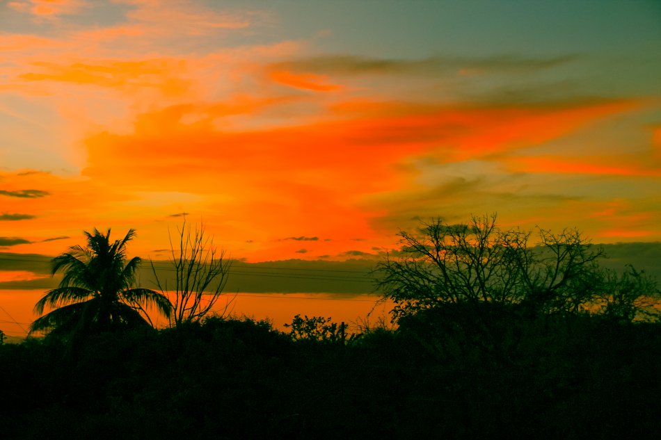 Das Leinwandbild X0029 öffnet ein Fenster zu einem atemberaubenden Sonnenuntergang, der den Himmel über dem idyllischen Ometepe in Nicaragua in ein Spektakel aus rotorange leuchtenden Farben taucht. Dichtes Laub, charakteristische Palmen und die markanten Umrisse karg verzweigter Bäume heben sich als dunkle Silhouetten gegen diesen belebten Abendhimmel ab. Die friedvolle Atmosphäre des Motivs wird durch die ruhigen Schatten und die stille Dämmerung, die sich über die Szene legt, unterstrichen.