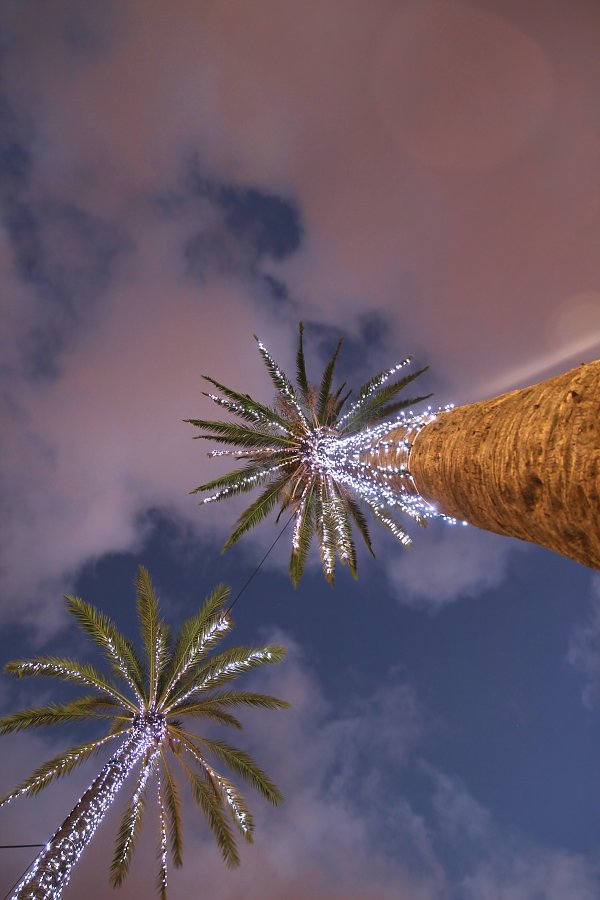 Diese Szene fängt den Geist der Kanarischen Inseln ein, speziell von Gran Canaria, und bildet eine Verbindung zwischen tropischer Wärme und weihnachtlicher Besinnlichkeit. Die Palme im Vordergrund wirkt besonders eindrucksvoll, da sie sich, von unten betrachtet, in den Nachthimmel streckt. Die Unschärfeeffekte und die violette Tönung des Himmels tragen zur mystischen Atmosphäre bei und laden zum Träumen ein. Die Las Palmas bezeichnende Umgebung wird hier in einem lila getönten Licht präsentiert, was Wärme und Exotik vermittelt, während die funkelnden Lichter die Vorfreude auf das Weihnachtsfest unterstreichen.