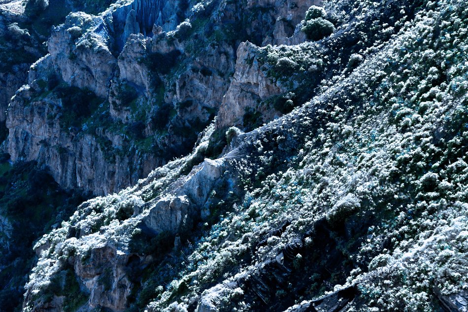 Das Leinwandbild IR0019 ist eine eindrucksvolle Darstellung der robusten, doch zugleich malerischen Natur der Kanarischen Inseln, insbesondere Gran Canaria. Die Aufnahme zeigt eine detailreiche Ansicht wilder Vegetation und Felsformationen, die typisch für diese Region sind. Sonnenlicht spielt auf den Oberflächen der Pflanzen und hebt ihre Textur und Vielfältigkeit hervor, während die Schatten die Tiefe und Rauheit der Szenerie betonen.