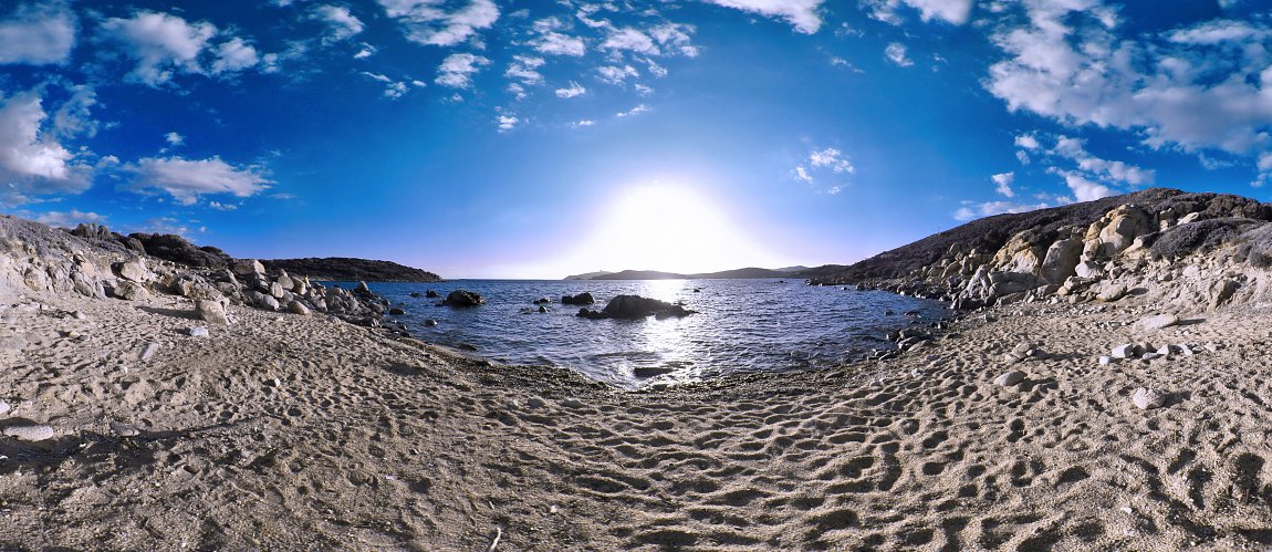 Das atemberaubende Panorama entführt Sie auf die italienische Insel Sardinien und präsentiert eine weitläufige Aussicht auf das glitzernde Mittelmeer. Durch die gekonnte Komposition des Bildes fühlen Sie sich, als würden Sie direkt am sanft geschwungenen Ufer einer sardischen Bucht stehen. Die Sonne neigt sich dem Horizont zu und taucht die Szene in ein warmes, goldenes Licht, das sanft auf den ruhigen Gewässern des Meeres reflektiert. Die mediterrane Küste mit ihren charakteristischen Felsenformen und der feinsandige Strand mit seinen natürlichen Spuren sind in diesem Panorama eindrucksvoll festgehalten.