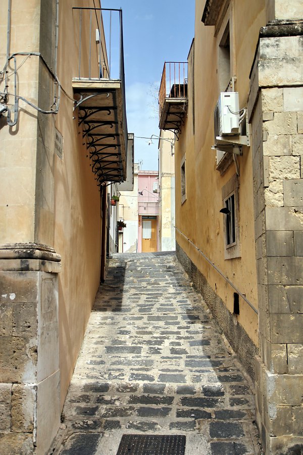 Das Leinwandbild "Enge Gasse" entführt den Betrachter in die malerischen Gassen der barocken Stadt Noto in Sizilien, Italien. Das Bild zeigt eine schmale Straße, die sich zwischen den warmen, ockerfarbenen Fassaden der mediterranen Gebäude hindurchschlängelt. Die sanfte Asymmetrie der Balkone, die Schattenspiele auf dem steinernen Weg und das Zusammenspiel von Licht und Architektur verleihen dem Bild eine ruhige, fast nostalgische Atmosphäre. Die klare, südliche Sonne Siziliens zeichnet scharfe Konturen und weckt Erinnerungen an einen entspannten Spaziergang durch die historischen Städte Italiens.